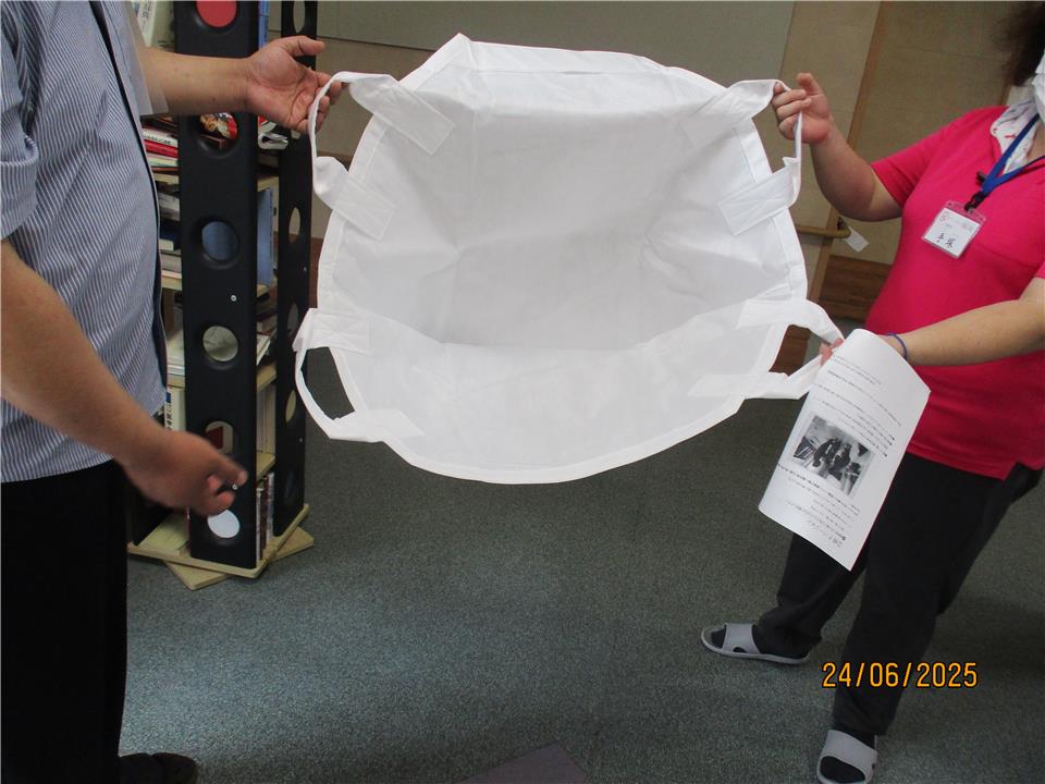 職員たちが協力して、救い帯を使用し入居者様を1階まで下ろします。