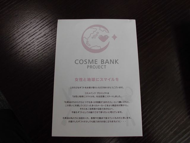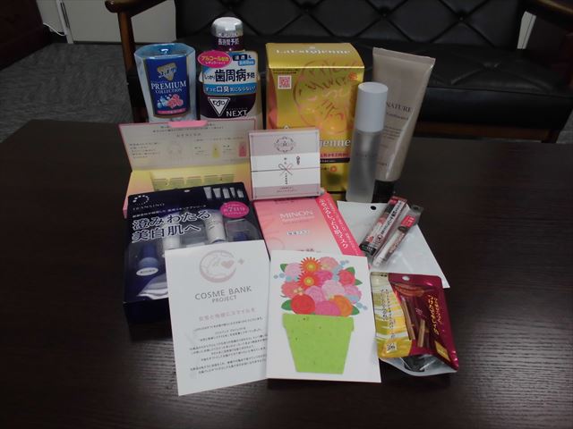 コスメバンクプロジェクトとは、その名のとおり化粧品類を集めて必要な人のところへ届ける活動になります♪化粧品類については、現行品から旧仕様の物、返品された未使用品などが、この活動に賛同したメーカー等から集められたそうです。早速寿山荘でも申し込みを行ったところ、これらの物が届きました。もちろん費用はかかりませんでした♪