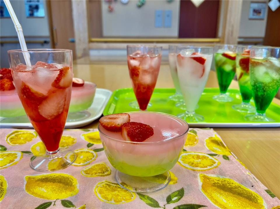 今年は三色のひしもちをイメージした、見た目がカラフルで味もとっても美味しいゼリーとソーダドリンクを作りました♪