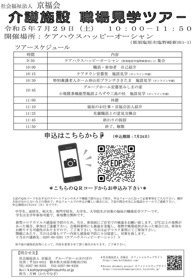 社会福祉法人 京福会 2023年7月29日(土)に開催予定の介護施設職場見学ツアーについて ~Excare dreamers project~
