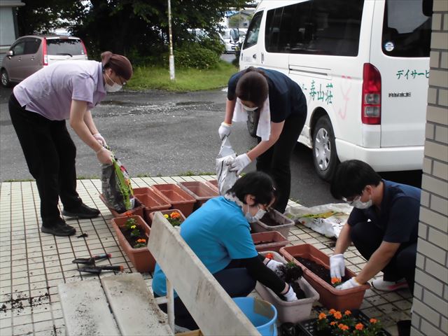 残りのプランターは、職員でお花を植えさせていただきました(^^ゞ次回は、天気が良い日に植え替えをしたいですね(^-^)梅雨の時期ですが、天気に負けず頑張りましょう(*^^*)♪