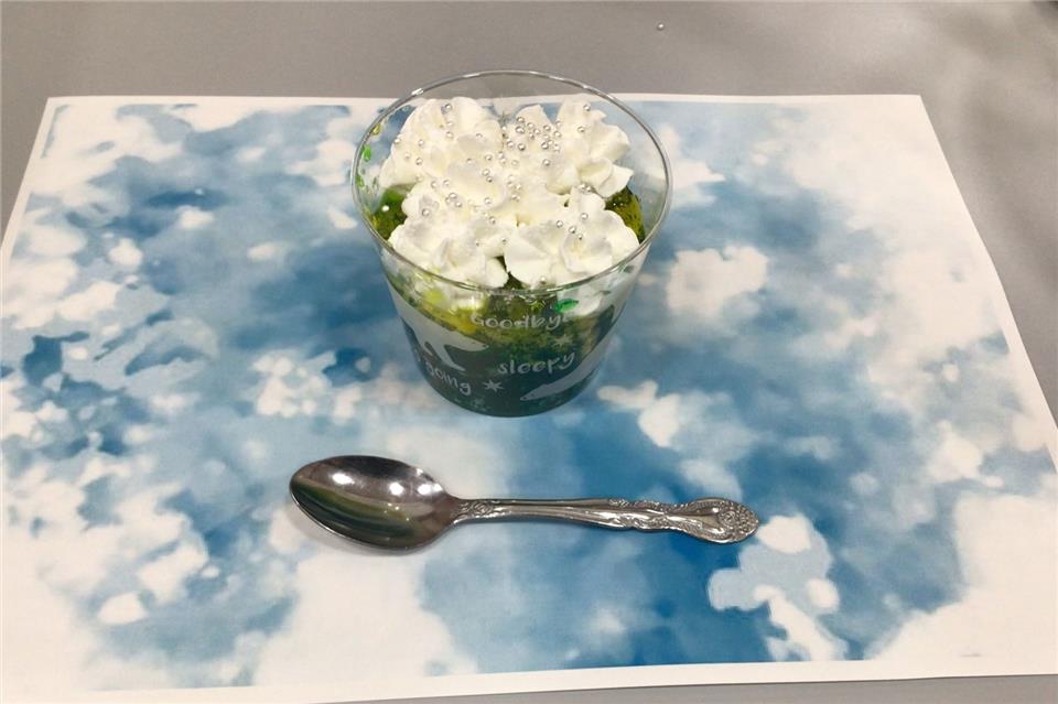 寒天を細かくしてメロンとレモンのかき氷シロップで色と味を付けてホイップでお花を作り
