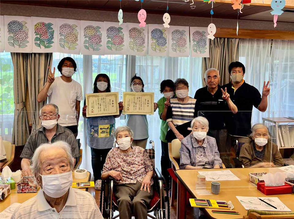 グループホームの職員さんですが、他施設において新型コロナウイルスの感染が広がってしまった際に応援職員として他施設の応援に駆けつけて下さった職員さんへの感謝状、そして日頃から入居者様に対しても職員に対しても優しく、困った時に助けてくれて施設運営に多大な貢献をして下さっている職員に対する慈愛賞をそれぞれ表彰しました!