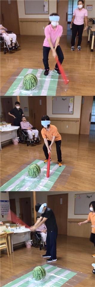 見て下さい!この巨大なスイカ!!果たしてこの巨大なスイカを割る事が出来るのでしょうか?? いざスイカ割りスタートです。まずは職員によるお手本から。