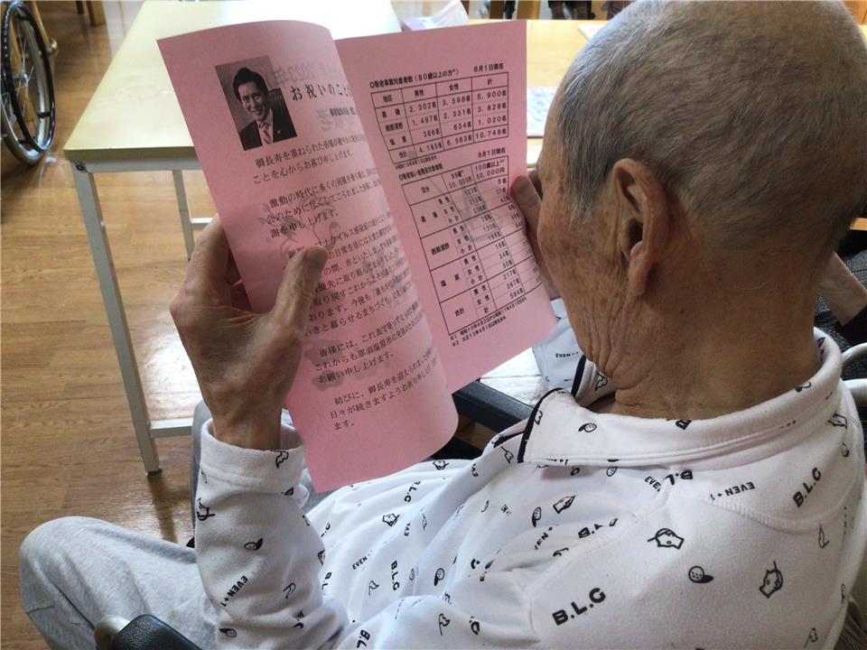 那須塩原市長からの祝電に真剣に目を通す入居者様。