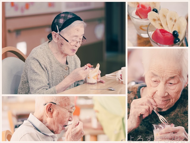大笑いのうちに表彰式が終わり、職員手作りのヨーグルトパフェでお茶会。摘みたての完熟ブルーベリーもご一緒に♡