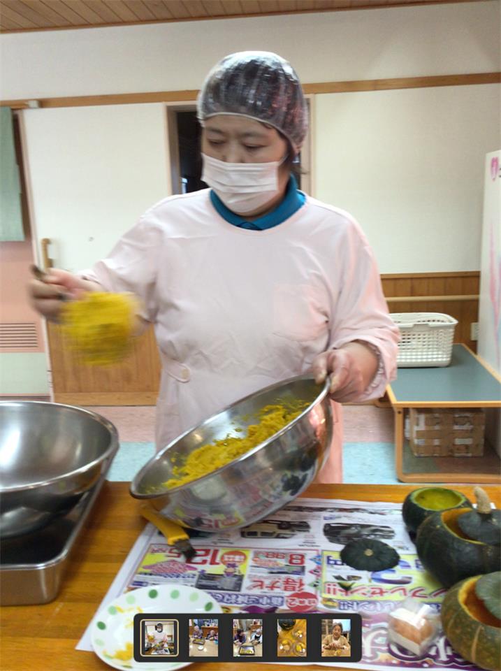 カボチャを電子レンジにかけて柔らかくし、職員がつぶします。