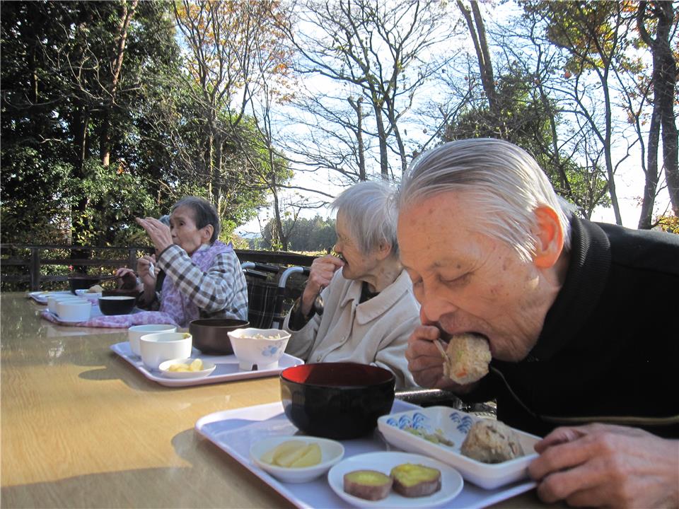 おにぎりをぱくり!お天気にも恵まれ、テラスに出て食べることができました。この日のメニューは、『芋煮、きのこの炊き込みご飯おにぎり、白菜と塩昆布の浅漬け、昔ながらの茹でさつまいも、りんご煮』でした。