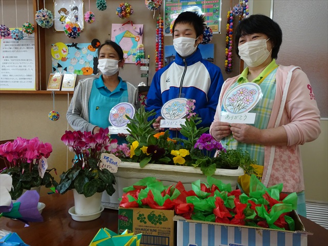 地域交流の一環として小中学校に、利用者の皆さま方と手作りした〝芳香剤〟をお届けしたり、新入生入学の時期には〝お祝いボード〟を贈らせていただきました。