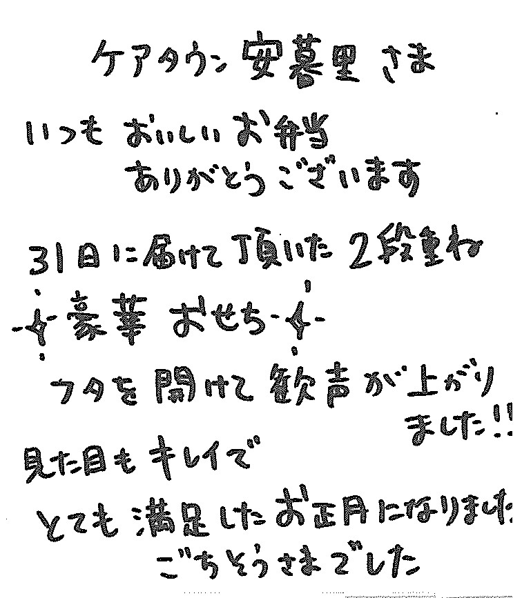 年も改まり、皆様にはこれまで以上にご満足いただけるようにと職員一同気持ちを新たにしております。本年もケアタウン安暮里の配食サービスをよろしくお願い申し上げます。