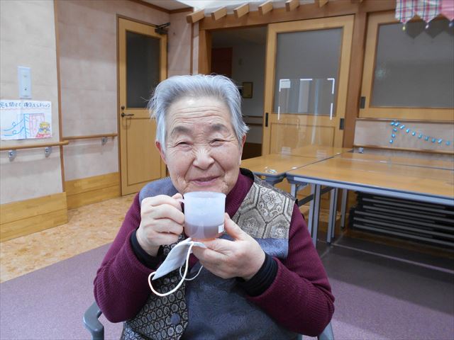 体操が終わったらしっかり水分補給をしますよ~今日はホットレモンティーをいただきました。体を動かして、暖かい飲み物をしっかりとりました。今年は、少しずつでもいろいろな行事を行えるようになりますように…