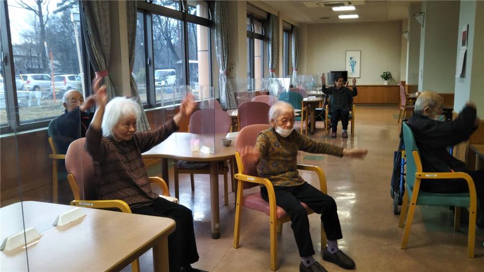 続いては、ラジオ体操の様子を紹介!!こちら週に3回健康増進と体力づくりの為に取り組んでいます。