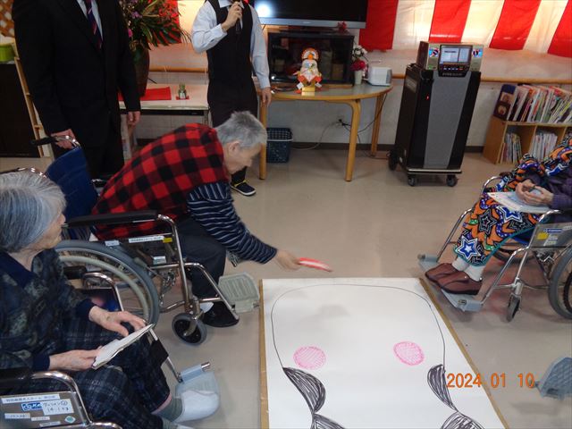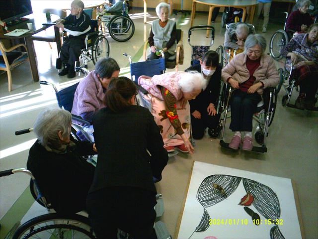 新年の遊びと言えば「福笑い」皆さんに目や口を離れた場所から投げてもらい顔を作ってもらいました。上手く出来たかな?