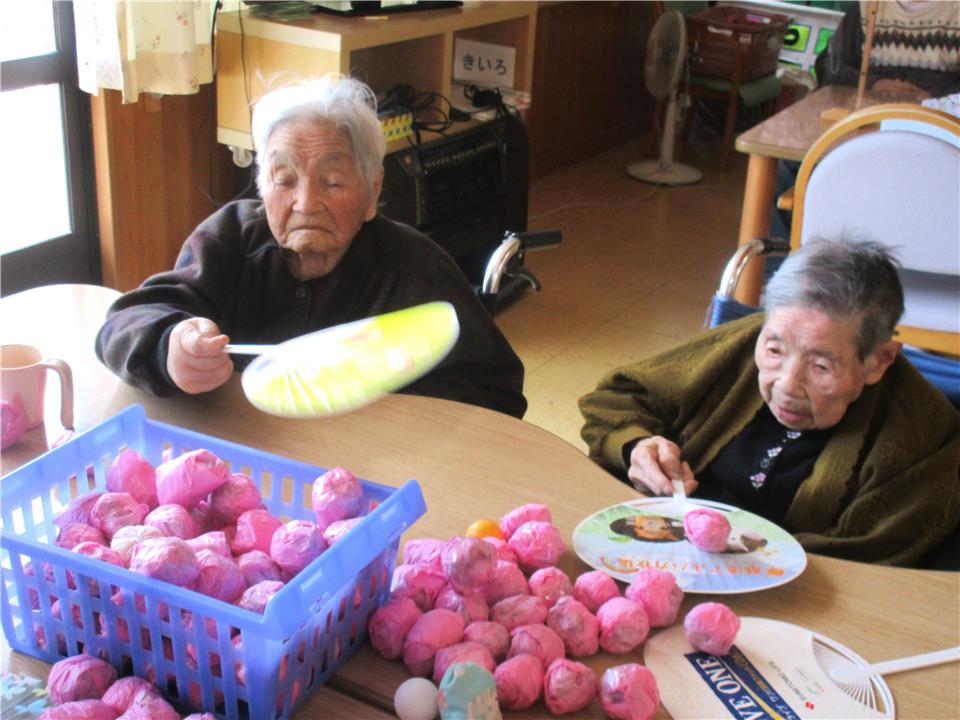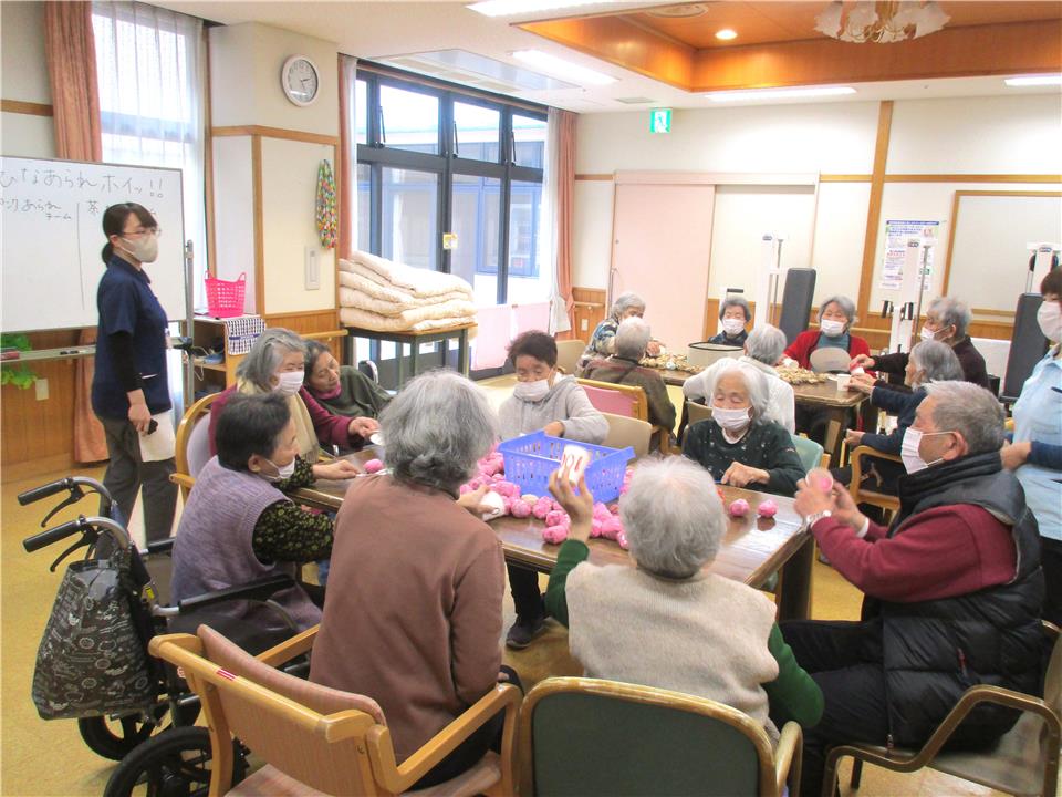 食後は、レクリエーションの「ひなあられホイ!!」ピンクあられチームと茶あられチームに分かれて対決です。「よーいドン!」皆さん、利き手ではない左手にうちわか、紙コップを持ち、あられを一つずつ乗せたり、入れたりしてから「ホイ!!」「なかなか乗らないな~」乗っても「ホイ!!が難しい」などおっしゃりながら、「あ~らよ!」御利用者様も職員も一緒になっての楽しいゲームでした🎶