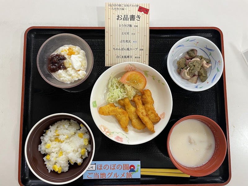 本日のメニューはこちら👉*とうきび飯 ~宮崎~*とり天 ~大分~*ぶた和え ~熊本~*ちゃんぽん風スープ ~長崎~*白くま風寒天 ~鹿児島~