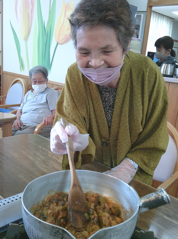 「新鮮なお野菜だから、みずみずしいわね~♪」「しっかり水分飛ばさなくちゃね~♪」