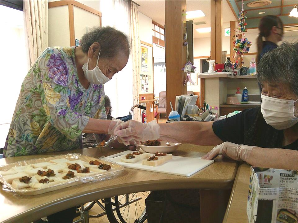 皆さん手際よく流れ作業でピザトースト作りです。・具材を炒める。・トーストをカットする。・炒めた具材をトーストに乗せる・そこにチーズを乗せてホットプレートで焼く