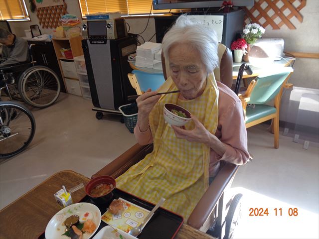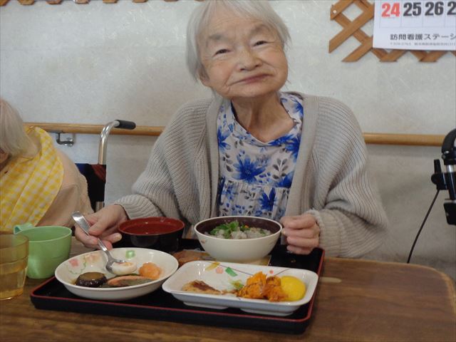 ちょっぴり豪華なメニューを堪能して、皆様「美味しい」と喜ばれていました。寿山荘では定期的に行事食メニューを楽しんで頂いています。いつまでも元気に食事を楽しめるよう、皆様の笑顔をエネルギーに日々の生活をサポートしていきたいと思います。