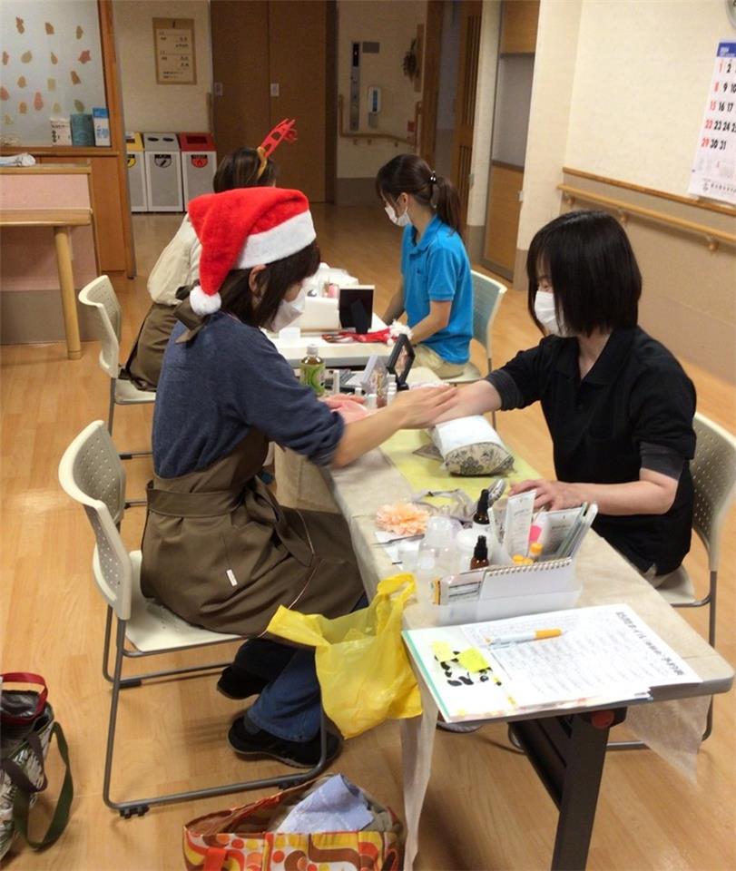 入居者様も職員も、とても嬉しそうにネイルを楽しんでいました。クリスマスにちなんだネイル、素敵です!福祉ネイリストの皆様どうもありがとうございました。