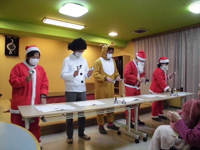 プレゼントの後は、職員によるハンドベルの演奏会です(^^♪真剣に演奏しました(*^-^*)綺麗な音色が奏でられたと思います(*^^*)