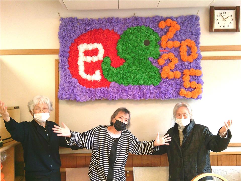 • 今年も、ご利用者様と職員の合作で干支のビックパネル作りました。恒例になってきましたね♪ 今年の干支は 『巳』 「蛇」に見えますかね~?(*ノωノ)  「今年もよろしくね!」のポーズ