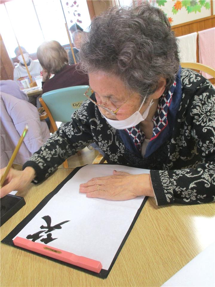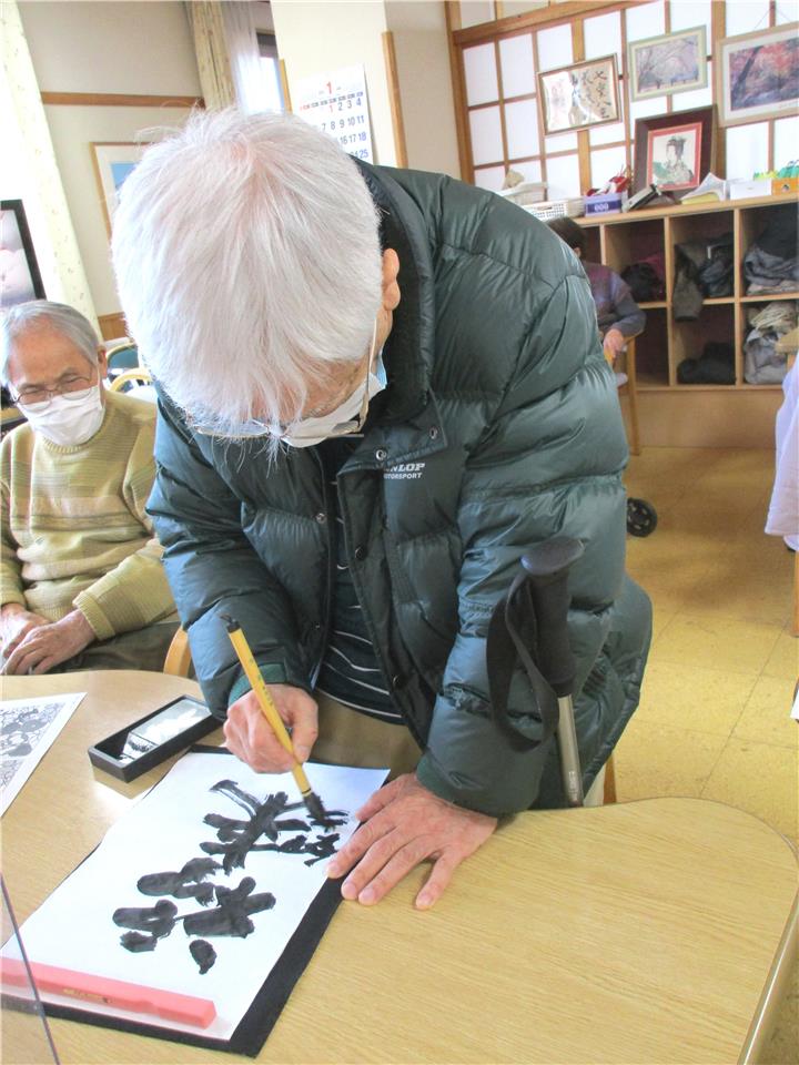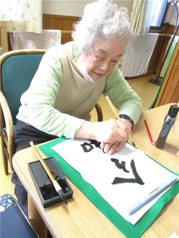 • 「書き初め」は、年の初めに美文字の願いを込めて書きます。皆さんは、どんな願いを込めて書くのでしょう?「何書いて良いかわからないよう~?」「自分の名前でも書くか~!」などが聞こえる中「笑う門には福来る」を書くご利用者が多かったですね~。私も、個人的に一番好きな言葉です(*^-^*)