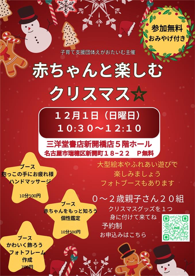 名古屋市東南部地域を中心に、子育て支援に尽力されている団体「えがおたいむ」さん( https://egaotime.crayonsite.com/ )が、12月にクリスマス会を開催されます。