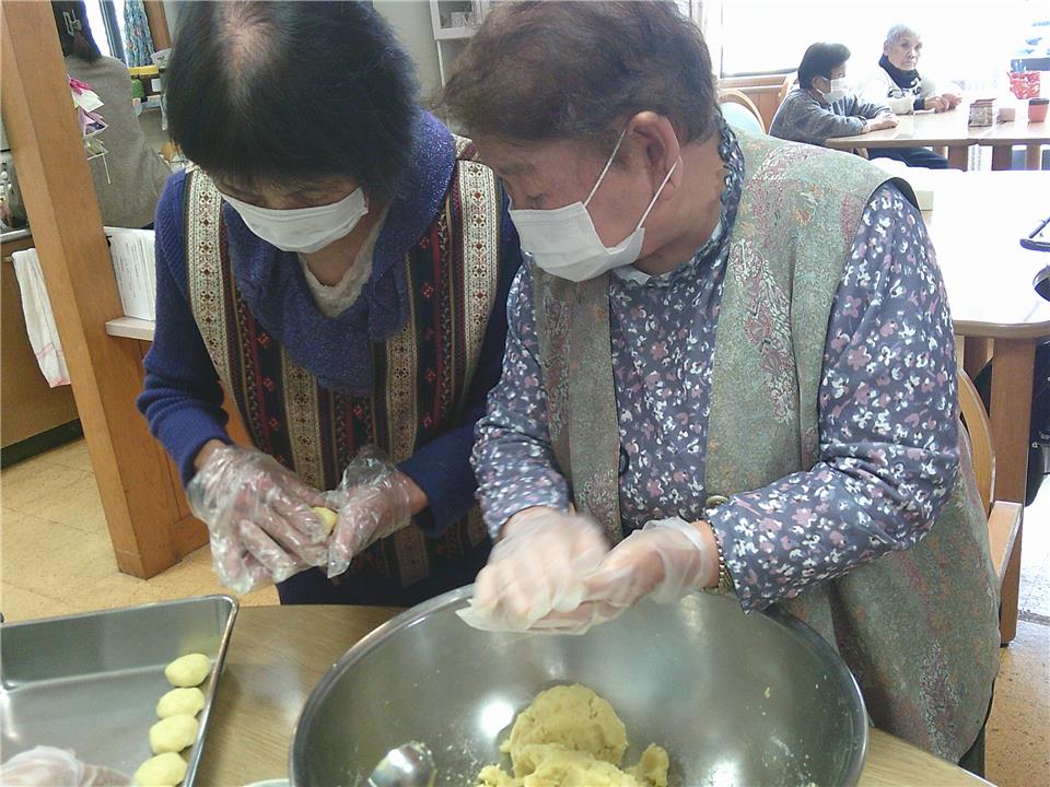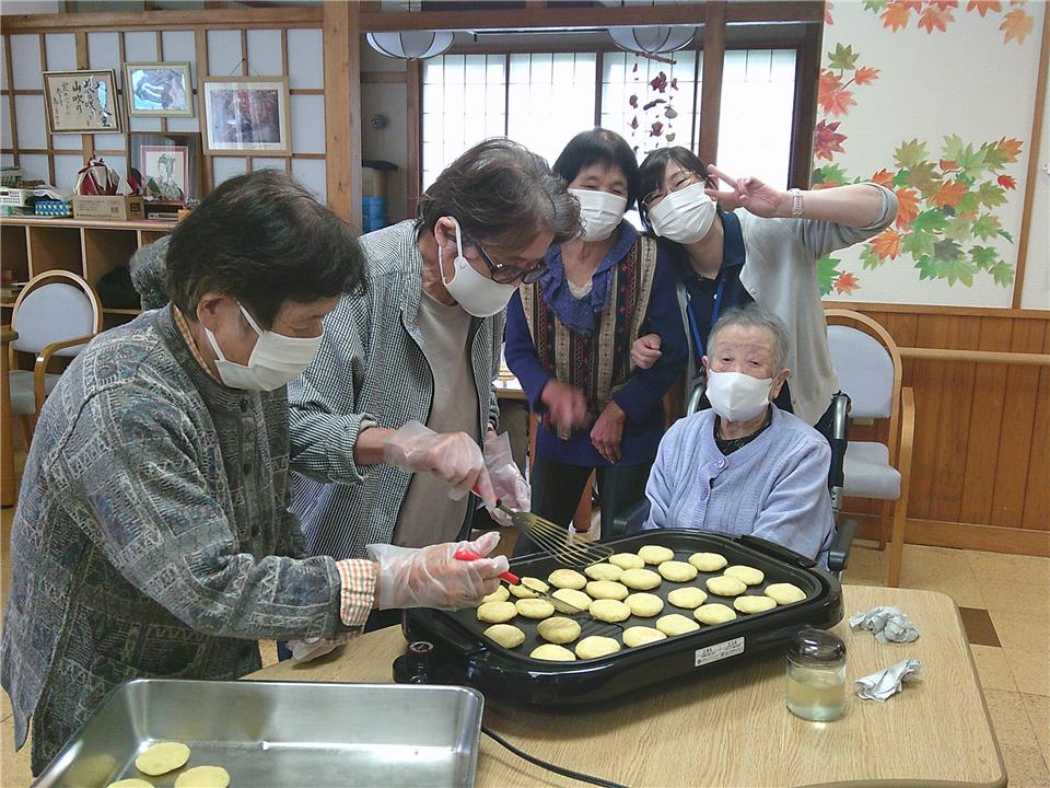 潰したお芋に片栗粉を混ぜて丸め、ホットプレートでこんがり焼き上げます!ほんのりと甘い香りがデイサービス内に広がり、皆さまから「いい匂い~!」「早く食べたいね」「楽しみ!!」と笑顔溢れました(*’▽’)