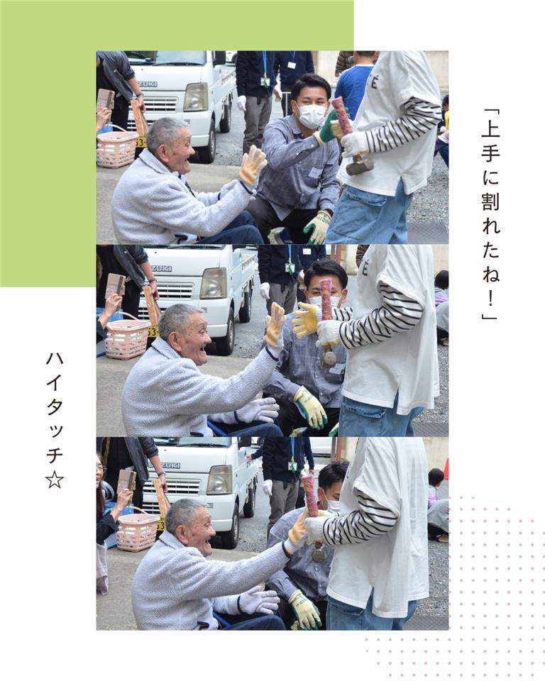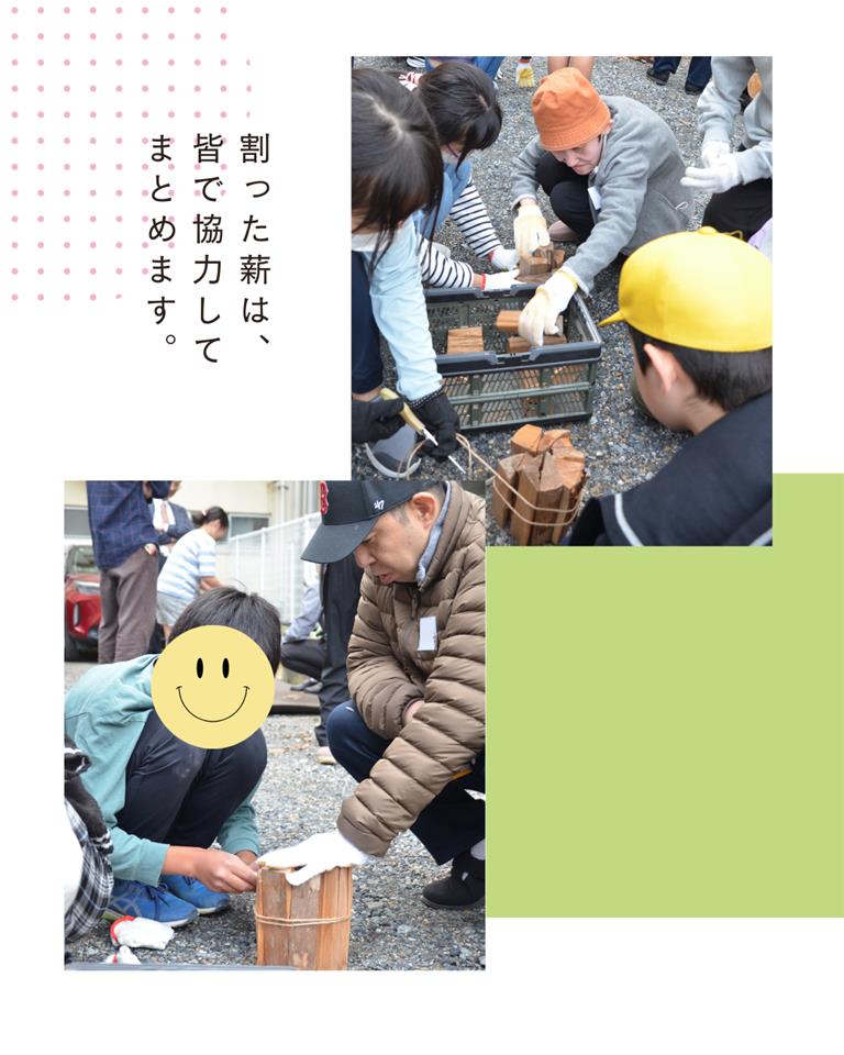 初めて挑戦する子どもが多く、最初はドキドキしながらもだんだんコツをつかんで力いっぱい薪を割っていました!利用者様と子どもがペアになって薪を割ったり、一緒に薪を束ねたりし、できたらお互い嬉しそうにハイタッチをしていました☺️
