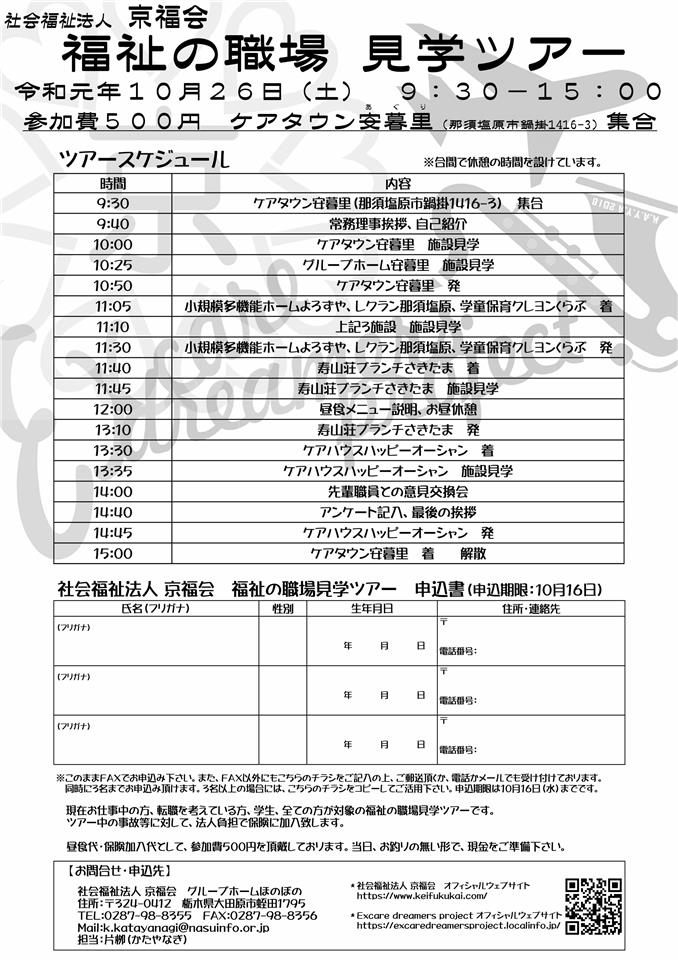 社会福祉法人 京福会では、令和元年10月26日(土)に福祉の職場見学ツアーを開催致します。